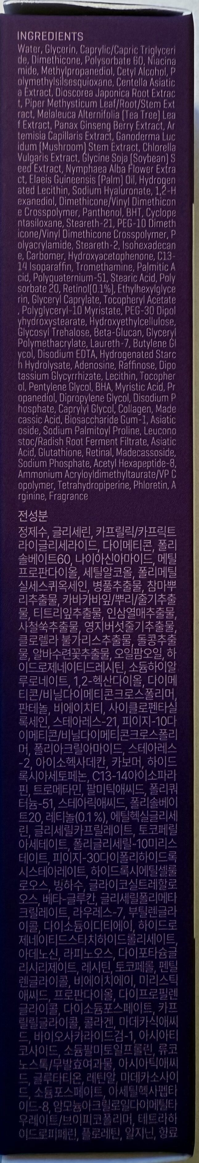 | Inhaltsstoffe | Water, Glycerin, Caprylic/Capric Triglyceride, Dimethicone, Polysorbate 60, Niacinamide, Methylpropanediol, Cetyl Alcohol, Polymethylsilsesquioxane, Centella Asiatica Extract, Dioscorea Japonica Root Extract, Piper Methysticum Leaf/Root/Stem Extract, Melaleuca Alternifolia (Tea Tree) Leaf Extract, Panax Ginseng Berry Extract, Artemisia Capillaris Extract, Ganoderma Lucidum (Mushroom) Stem Extract, Chlorella Vulgaris Extract, Glycine Soja (Soybean) Seed Extract, Nymphaea Alba Flower Extract, Elaeis Guineensis (Palm) Oil, Hydrogenated Lecithin, Sodium Hyaluronate, 1,2 -Hexanediol, Dimethicone/Vinyl Dimethicone Crosspolymer, Panthenol, BHT, Cyclopentasiloxane, Steareth-21, PEG-10 Dimethicone/Vinyl Dimethicone Crosspolymer, Polyacrylamide, Steareth-2, Isohexadecane, Carbomer, Hydroxyacetophenone, C13-14 Isoparaffin, Tromethamine, Palmitic Acid, Polyquaternium-51, Stearic Acid, Polysorbate 20, Retinol(0.1%), Ethylhexylglycerin, Glyceryl Caprylate, Tocopheryl Acetate, Polyglyceryl-10 Myristat e, PEG-30 Dipolyhydroxystearate, Hydroxyethylcellulose, Glycosyl Trehalose, Beta-Glucan, Glyceryl Polymethacrylate, Laureth-7, Butylene Glycol, Disodium EDTA, Hydrogenated Starch Hydrolysate, Adenosine, Raffinose, Dipotassium Glycyrrhizate, Lecithin, Tocopherol, Pentylene Glycol, BHA, Myristic Acid, Tranexamic Acid, Propanediol, Dipropylene Glycol, Disodium Phosphate, Caprylyl Glycol, Collagen, Madecassic Acid, Biosaccharide Gum-1, Asiaticoside, Sodium Palmitoyl Proline, Leuconostoc/Radish Root Ferment Filtrate, Asiatic Acid, Glutathione, Retinal, Madecassoside, Sodium Phosphate , Ferulic Acid, Acetyl Hexapeptide-8, Ammonium Acryloyldimethyltaurate/VP Copolymer, Tetrahydropiperine, Phloretin, Arginine, Fragrance |
